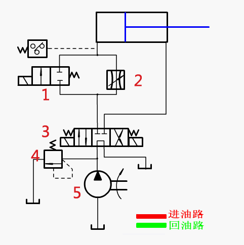 油路說明:在進(jìn)油管路上設(shè)置節(jié)流閥,控制液壓油流量,進(jìn)而控制活塞桿移動(dòng)速度